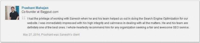 Here’s the recommendation that Prashant Mahajan, one of the co-founders left on our CEO’s Linkedin Profile:
