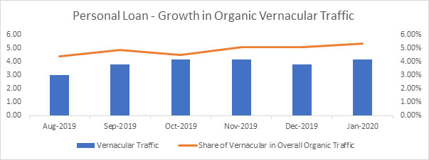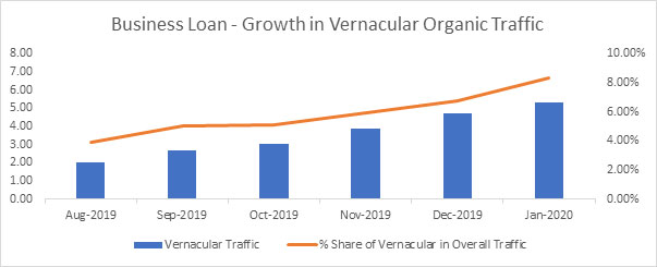 In the Business Loan campaign, vernacular traffic’s contribution grew from under 4% to over 8.3% of the overall organic traffic. Again, a significant achievement given that there was no further headroom for growth via English keywords.