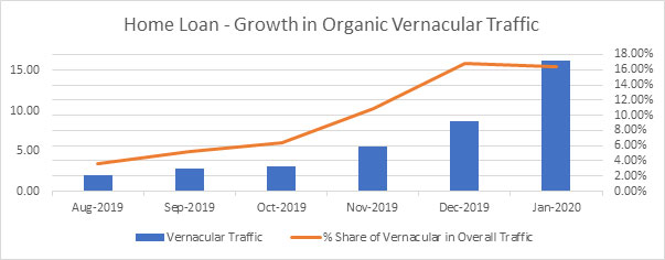 In the Home Loan campaign, organic vernacular traffic grew by over 700% in the 6 month period under consideration. It’s contribution grew from under 4% to over 16.4% of the overall organic traffic. Again, a significant achievement given that there was little headroom for growth via English keywords.