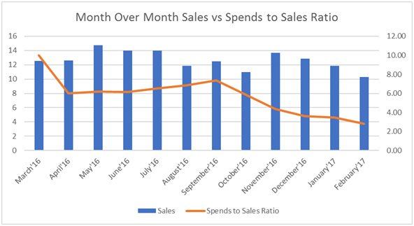 The overall spends-to-sales ratio decreased significantly by 72% in February 2017 from March 2016. Maintaining a sale volume above the client’s expectations while constantly reducing the cost per sale, gave a big boost to our confidence.