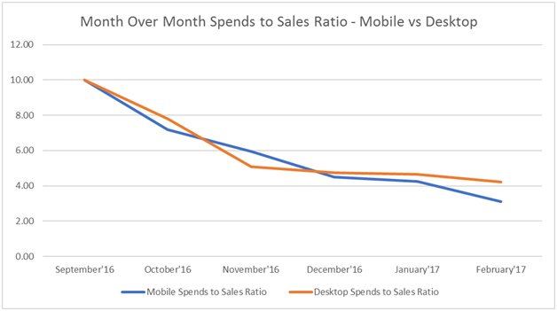 We witnessed a considerable decrease in spends-to-sales ratio on both mobile and desktop – on mobile devices an impressive decrease of 69 percent was witnessed while on the desktop the decrease was slightly less, but still impressive at 58 percent.