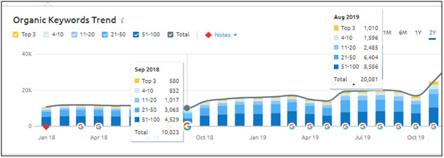 From the month of Sep’18 to Aug’19 we saw a gigantic improvement [85%] in keywords ranking in the top 10 that have massive search volume growth.